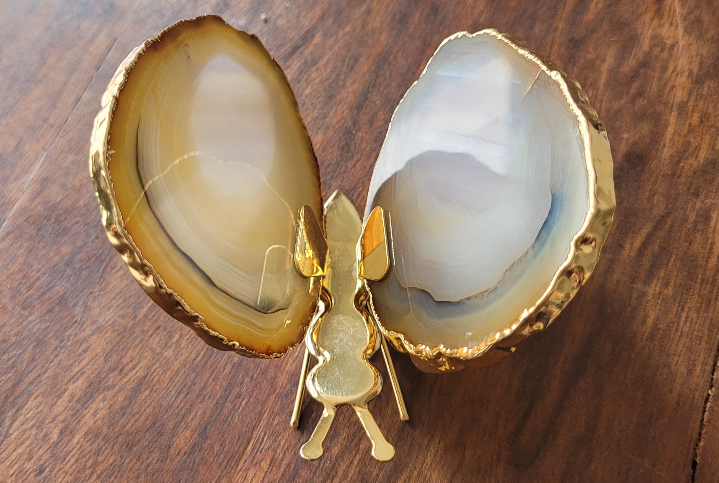BORBOLETA EM PRDRA NATURAL AGHATA COM METAL COM BANHO DOURADO.